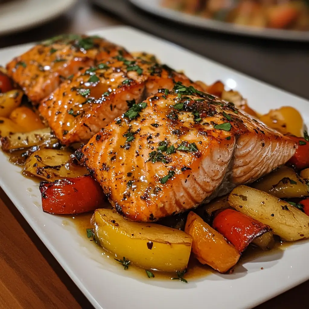 Once everything is cooked to perfection, take it out of the oven. Serve the salmon and veggies warm, drizzled with any remaining apple glaze. This dish looks beautiful on the plate, and the aroma will have everyone gathering around the table. Enjoy your culinary masterpiece!