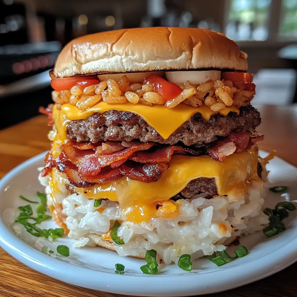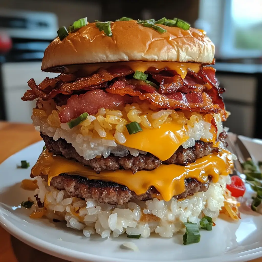 Keywords: Bacon Cheeseburger, Rice Stack, Comfort Food, American Cuisine