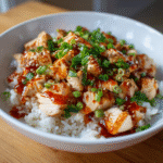 Now for the fun part! Grab your serving bowls and start with a generous scoop of cooked rice at the bottom. This is the cozy base for your Bang Bang Chicken. Next, spoon the saucy chicken right on top of the rice. Don’t be shy—make it a hearty portion! The rice will soak up all those amazing flavors.