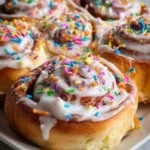 Delightful cinnamon rolls infused with the rich flavors of birthday cake, topped with creamy frosting and colorful sprinkles.