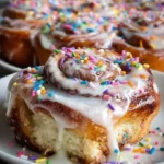 A delightful twist on classic cinnamon rolls featuring birthday cake flavors, complete with cream cheese frosting and colorful sprinkles.
