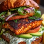 There’s something enchanting about the moment a perfectly cooked piece of salmon meets a hot skillet. Picture it: the salmon fillets sizzling as they make contact with the pan, releasing an intoxicating aroma that fills your kitchen with warmth and excitement. As they cook, the edges darken into a deep, caramelized crust—a striking contrast to the tender, flaky fish that lies beneath. Take your first bite, and you’ll experience a delightful symphony of flavors, from the bold, smoky notes of spiced Cajun seasoning to the rich creaminess of avocado and velvety sauce, all sandwiched between soft, toasted buns.