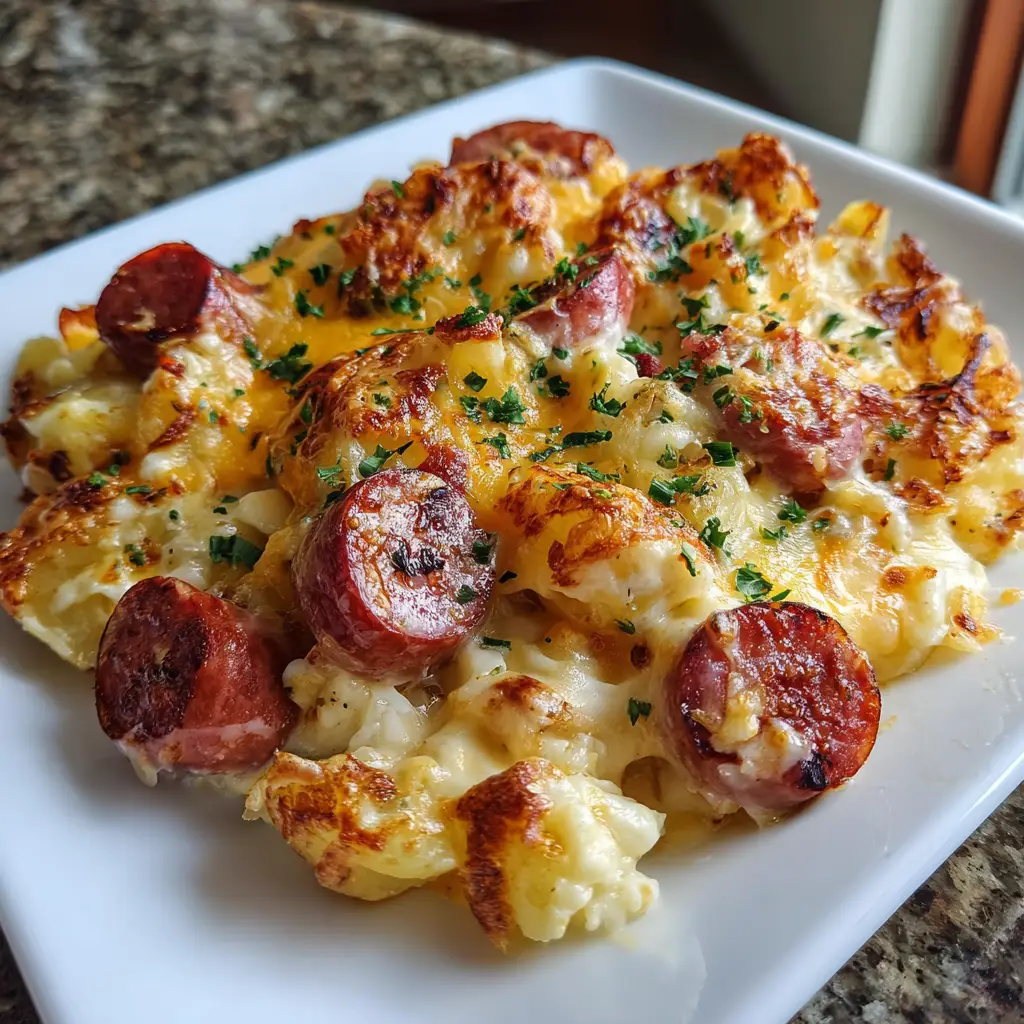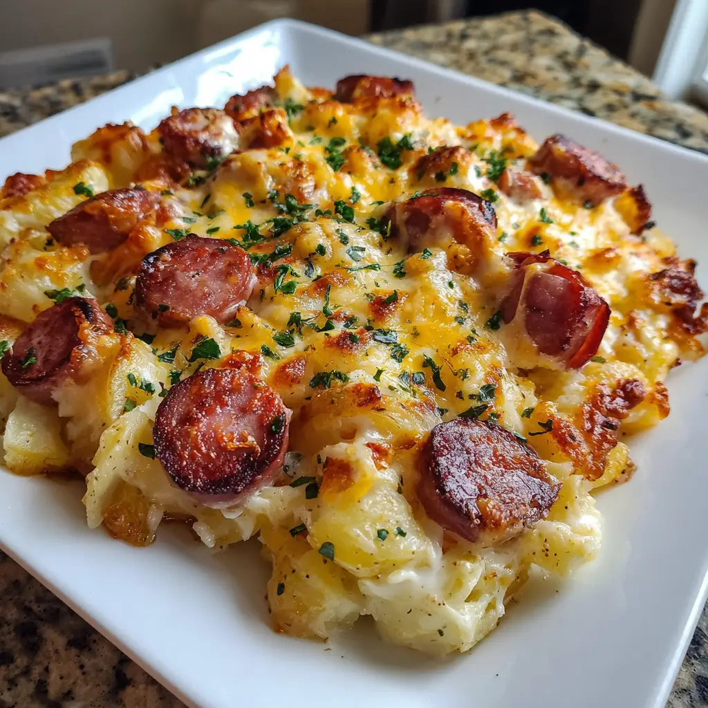 A delicious and hearty dish featuring cheesy ranch potatoes combined with smoked sausage, perfect for a comforting meal.
