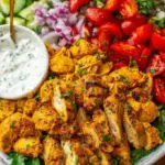 A vibrant salad featuring spiced, tender chicken and fresh vegetables, dressed in a creamy yogurt-tahini sauce.