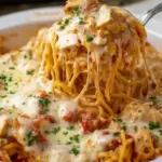 A warm and cheesy Chicken Spaghetti Casserole that combines tender spaghetti, shredded chicken, and a zesty kick from Rotel tomatoes. Perfect for family dinners or gatherings.