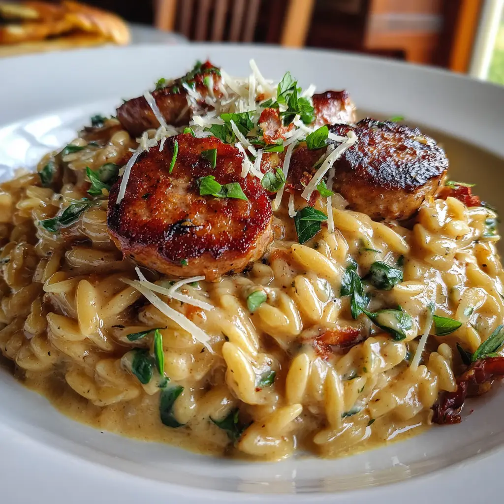 Keywords: Creamy Tuscan Sausage Orzo, Italian pasta dish, comfort food