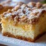 A delightful crumb cake featuring a buttery flavor, soft texture, and a crunchy topping that evokes nostalgia.