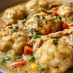 A cozy and comforting dish with creamy chicken and fluffy dumplings, perfect for chilly evenings.