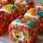 A vibrant and playful dessert that combines the crunchy flavor of Fruity Pebbles with marshmallows and cream cheese, wrapped in a sushi style for a fun culinary experience.
