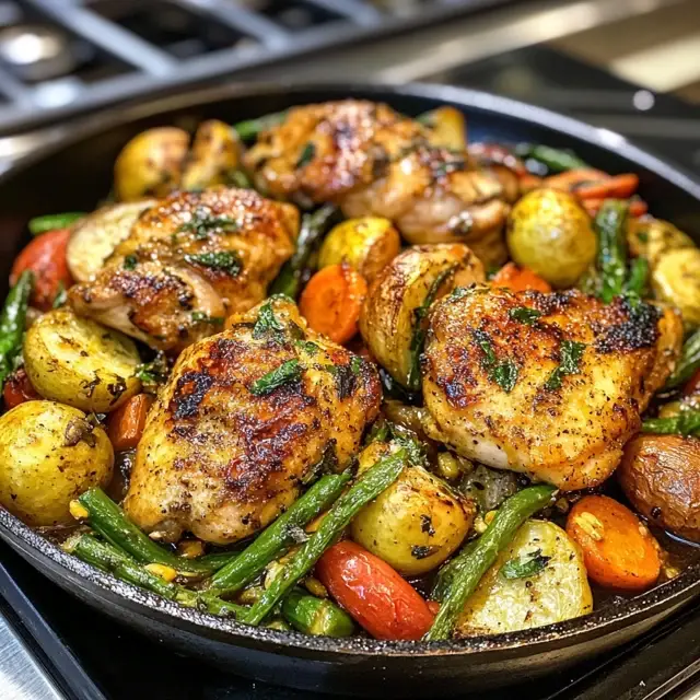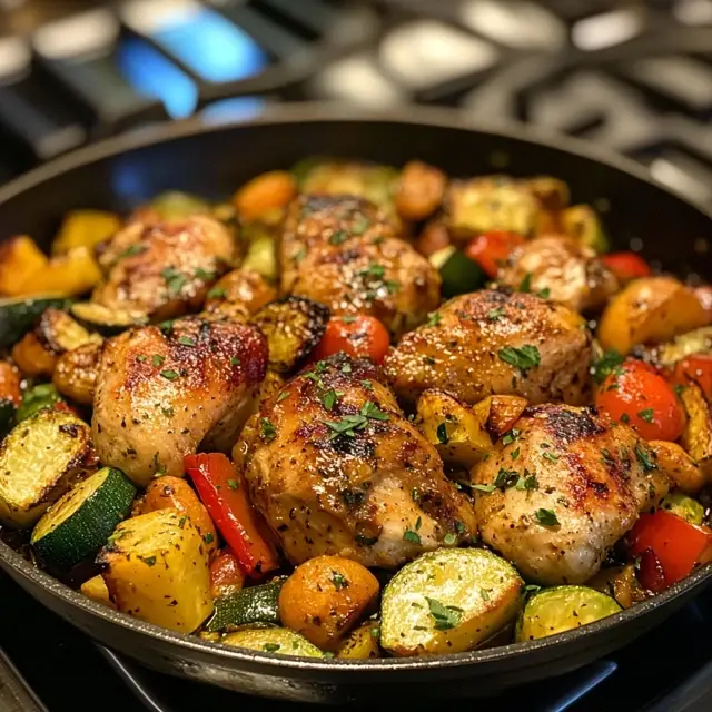 A delicious one-pan meal featuring tender chicken cooked in garlic butter, paired with fresh summer vegetables for a wholesome dinner.
