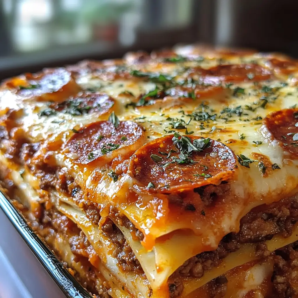 A delicious and cheesy casserole that combines the flavors of pizza and lasagna, perfect for family dinners.