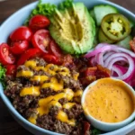 Savor the deliciousness of a classic cheeseburger in a healthy bowl format, featuring lean ground beef, fresh veggies, and a creamy homemade sauce.