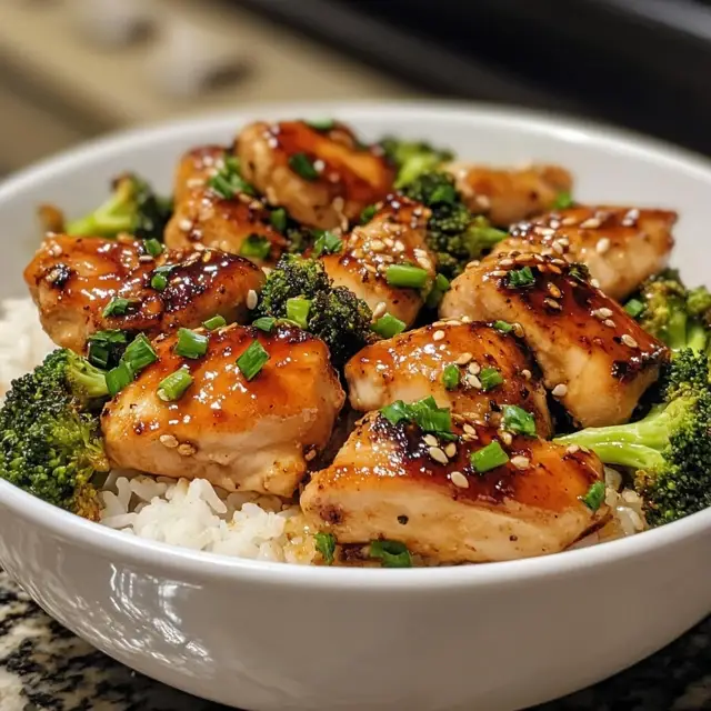 A delicious and easy-to-make dish featuring tender honey garlic chicken served with roasted broccoli and fluffy rice.