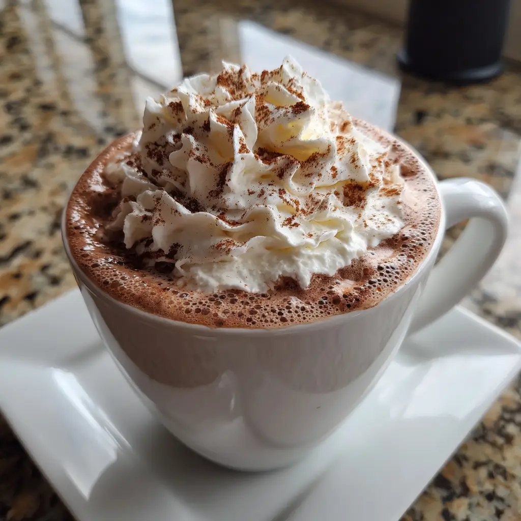 A rich and creamy hot chocolate topped with fluffy cinnamon whipped cream, perfect for cozy evenings.