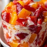 Lush layers of vibrant fruit glisten under a bewitching sheen of jello, their colors delicately merging and mingling like a painter’s palette. Picture this: a bowl resting at the center of your table, an inviting halo of crimson strawberries and sunny mandarins peeking through translucent, jewel-toned gelatin. The moment you dip your spoon into this colorful creation, a wave of nostalgia envelops you, evoking memories of sunny picnics and family gatherings, where laughter rises like the sweet aroma of ripe fruit and cool whipped cream.