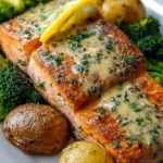 A delicious and healthy meal featuring tender salmon fillets, crispy roasted potatoes, and vibrant broccoli, all elevated by a zesty lemon butter sauce.