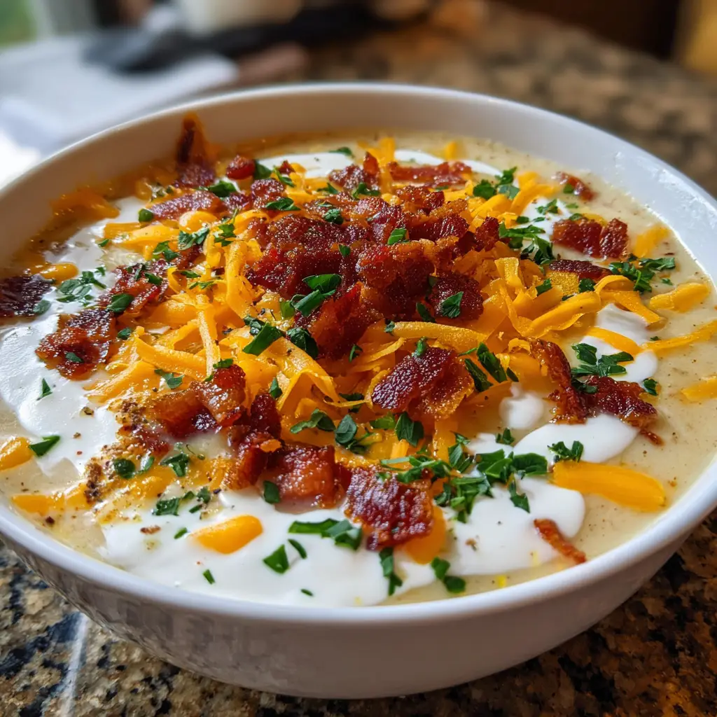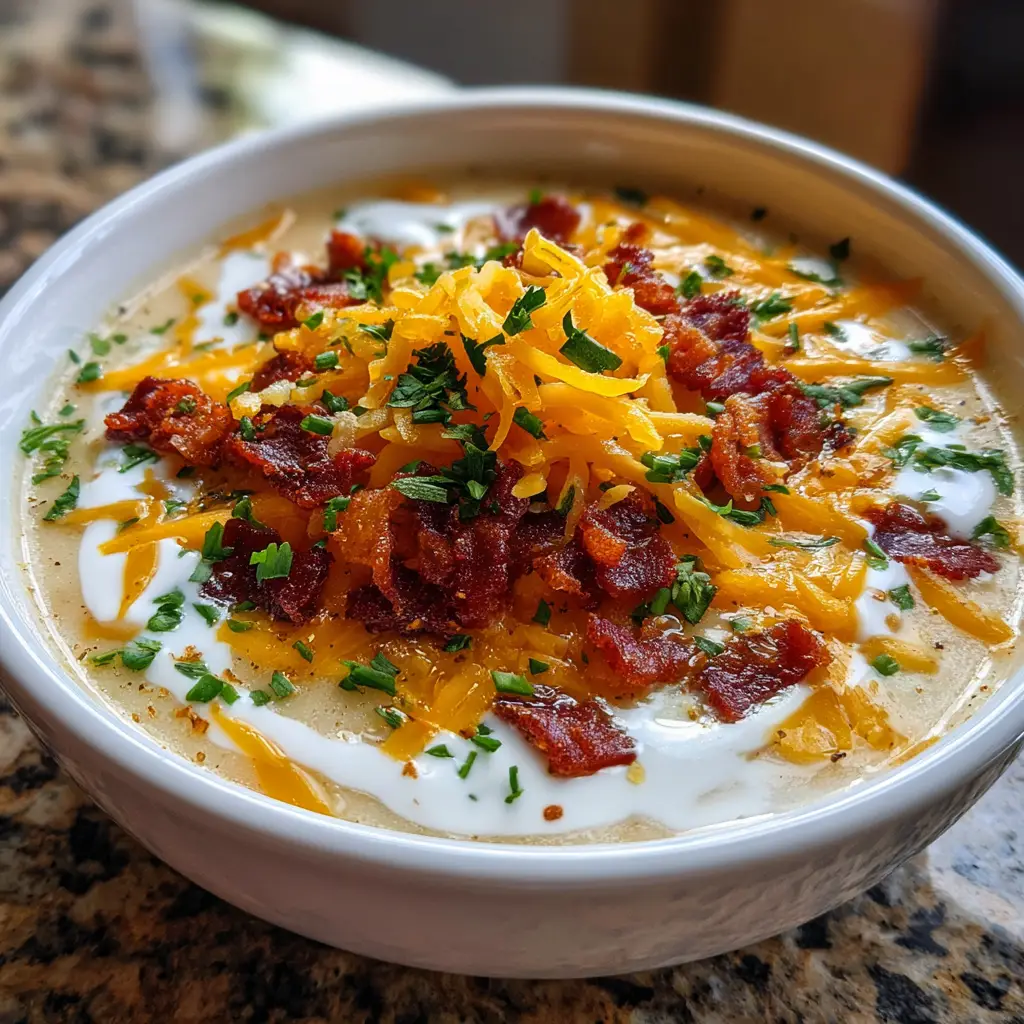 A creamy and hearty soup loaded with baked potatoes, cheese, bacon, and green onions, perfect for a comforting meal.