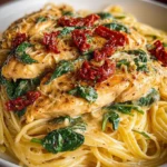 A delightful dish of juicy chicken, sun-dried tomatoes, and fresh spinach enveloped in a creamy sauce over pasta, perfect for any occasion.