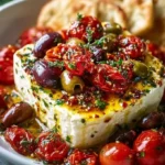 A vibrant appetizer featuring creamy baked feta, roasted cherry tomatoes, and olives, perfect for dipping with crusty bread or pita.