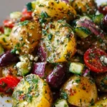A vibrant and refreshing Mediterranean Potato Salad that combines creamy potatoes with crisp vegetables and a tangy dressing, perfect for any occasion.