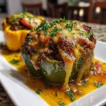 Time to fill those peppers! Carefully spoon the beef and veggie mixture into each hollowed pepper. Don’t be shy—pack it in there! Just be cautious not to overfill, or you’ll have a cheesy overflow situation. We want delicious, not messy!