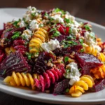 A delicious and vibrant pasta salad featuring roasted beets and creamy goat cheese, perfect for any occasion.