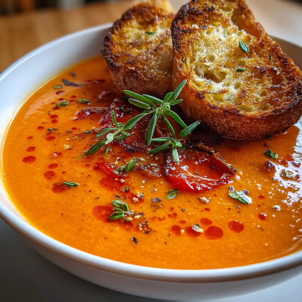 A comforting and flavorful roasted red pepper and tomato soup that warms the soul.