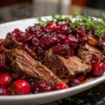 A delicious and tender beef brisket slow-cooked with cranberry sauce for a flavorful meal.