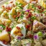 A creamy, rich potato salad featuring crunchy vegetables and crispy bacon, perfect for gatherings.