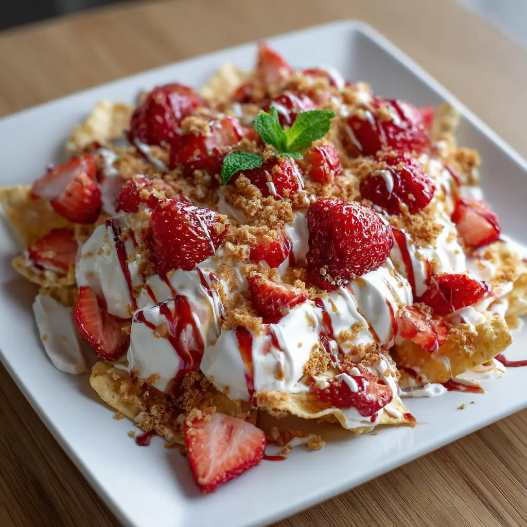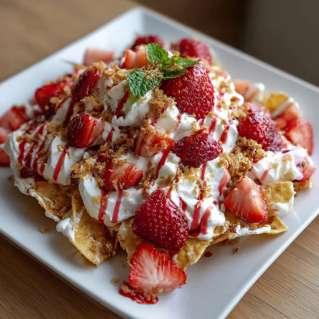 A delicious and fun dessert that combines the flavors of strawberry cheesecake with crispy nachos, perfect for sharing.