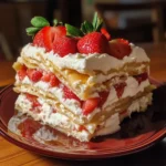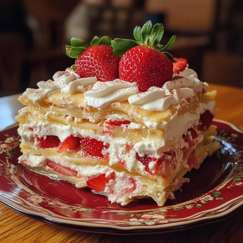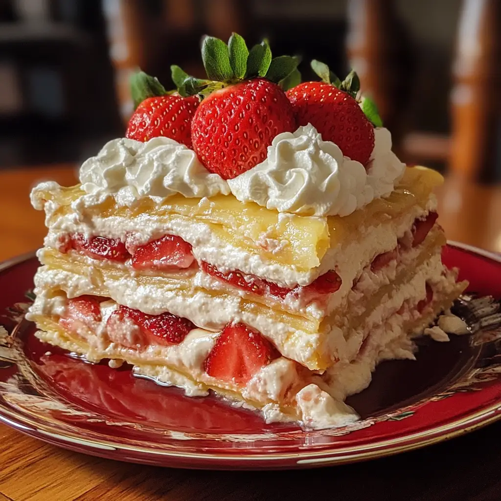 A delightful and refreshing dessert that combines layers of strawberries, creamy filling, and cake in a lasagna format.